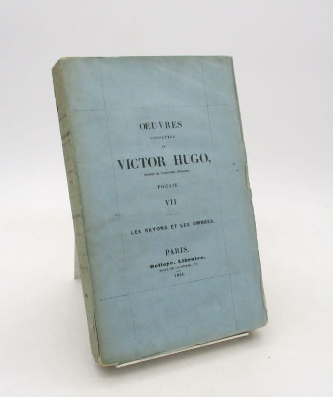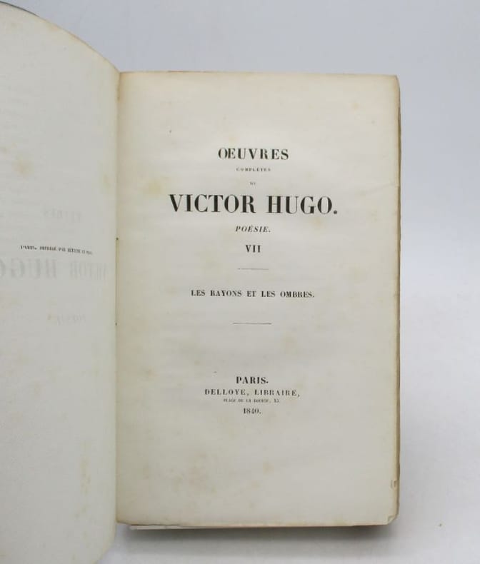Édition originale pour "Les Rayons et les Ombres". L'édition Renduel-Delloye (1832-1842) est la première édition collective des oeuvres de Victor HUGO, elle se compose de 27 volumes dont certains sont en éditions originales. Les volumes I à VI sont, pour l'édition Renduel-Dilloye, des rééditions. "L'ensemble est assez rare, souvent assez roussis" (Clouzot, Guide du bibliophile français, 154). (Vicaire IV, 376-378).Provenance : Madame la marquise de Courtarvel, nom inscrit au crayon à papier sur la page de garde de chacun des volumes, d'un lot de livres provenant de la bibliothèque du château de la Seilleraye (44).