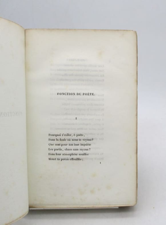 Paris, Renduel et Delloye, 1838-1841. 7 volumes in-8, I, II et III : Renduel, 1838, 362, 439 et 368 pp. ; IV : Delloye, 1841, (4), 316 pp. ; V : Renduel - Delloye, 1839, 336 pp. ; VI et VII : Delloye, 1840, 320 pp. et (4)-XIII-(3)-389-(1) pp.. Reliure de l'époque demi-veau blond glacé, filets dorés, coiffes légèrement frottées, trace d'eau sur les dos des volume I et II, quelques rares rousseurs très claires sur les tranches, les pages en sont quasi exemptes. Très bel ensemble complet des 7 volumes de la partie poésie des oeuvres complètes.