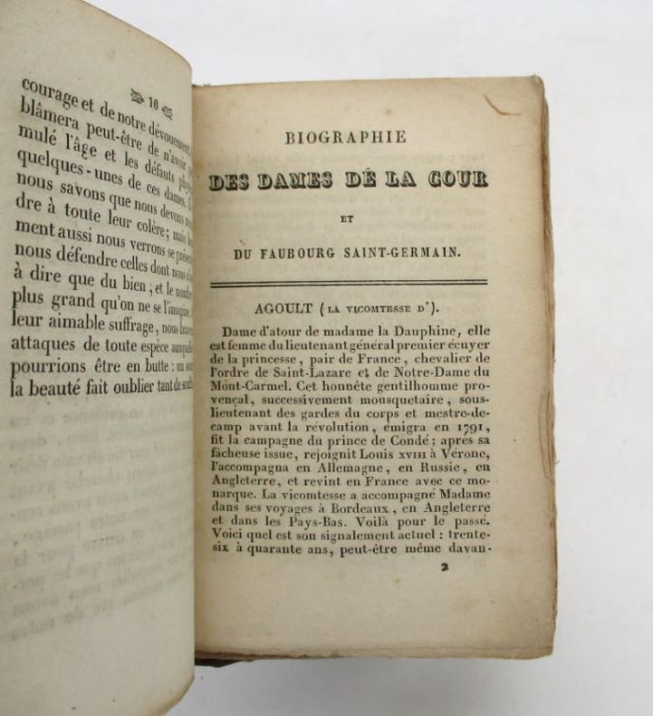 EDITION ORIGINALE (Gay I, 404). Violent pamphlet contre les femmes de la haute aristocratie, et quelques femmes en vue de la société du temps. Parmi elles, Mme de Chastenay, Mme Récamier, la vicomtesse d’Arlincourt épouse du frénétique auteur du Solitaire, Mme Benoist, Mme de Chateaubriand, la duchesse de Dino, la duchesse de Duras, Delphine Gay, Mme de Genlis...