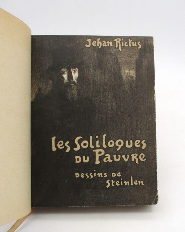 Les soliloques du pauvre. Edition revue, corrigée et augmentée de poèmes inédits. In 12 broché, 140x190mm. Couverture illustrée en couleurs, faux-titre, frontispice ajouté (un portrait de l’auteur) titre, 236 pages, nombreux dessins de STEINLEN dans le texte, hors texte, en tête, culs de lampe. Documents ajoutés : les soliloques du pauvre par Jeanne LEANDRE, un portait en pied par LEANDRE, Un texte de Léon BLOY (mercure de France 1903) En dernière page : coupures de journaux « un poète est mort » personne, pas un parent, pas un ami pour veiller le pauvre Jehan RICTUS journal le Jour 9 novembre 1933. Eugène REY éditeur 1919. Couverture modeste, bon état intérieur