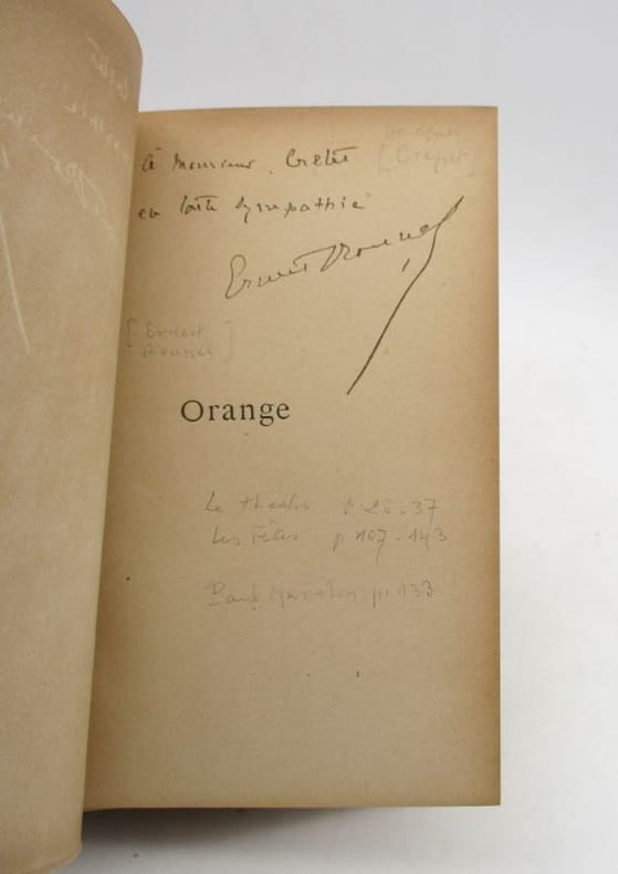 Édition originale et unique de cet ouvrage consacré à la ville d'Orange. Elle est illustrée de reproductions photographiques de H. Moret dont 20 planches hors-texte. Cet exemplaire comporte un envoi autographe signé de l'auteur à Jacques Crépet (mal orthographié en Cretee). Ex-libris héraldique de J[acques] Crépet (fils de l'homme de lettres Eugène Crépet) et de J[ean] Ziegler (fils de Jacques). Fermeture pour congés, TRAITEMENT DES COMMANDES SUPSENDU JUSQU'AU 29 DECEMBRE. * Membre du SLAM et de la LILA / ILAB Member. La librairie est ouverte du lundi au vendredi de 14h à 19h. Merci de nous prévenir avant de passer,certains de nos livres étant entreposés dans une réserve.