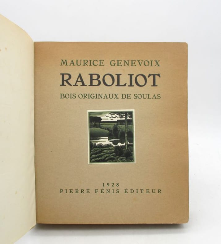 Paru dans la prestigieuse collection bibliophilique de La Belle Édition, ce Raboliot s'inscrit dans un ensemble de six titres de Maurice Genevoix sélectionnés pour leur caractère « naturaliste ». Chaque volume est confié à un illustrateur différent : Routes de l'aventure, avec des aquarelles de Pierre-Eugène Clairin ; La Boîte à pêche, avec des compositions d'André Collot ; La Dernière harde, avec des compositions et gravure à l'eau-forte en frontispice par Odette Denis ; Rémi des Rauches, avec des aquarelles de Jacques Thévenet et Rroû avec des illustrations de A. D. Steinlen, - et ce Raboliot, confié aux compositions sensibles de Paul Jarach. L'exemplaire ici présenté fut imprimé spécialement pour Sylvie Genevoix et conservé aux Vernelles, la maison familiale solognote acquise par Maurice Genevoix après le succès de Raboliot. Sylvie Genevoix y est née, y a grandi, et y a vu naître son propre rapport à la nature et à l'écriture. Elle évoquera cette maison dans une préface lumineuse à La maison de mon père : « C'est dans son havre des «Vernelles», sur un coteau dominant la Loire, que l'essentiel de l'écriture et de la vie de Maurice Genevoix s'est écoulé, à l'image du fleuve qu'il contemplait depuis son bureau. C'est dans ce nid des Vernelles que je suis née, que j'ai fait mes premiers pas, la main dans la main de mon père, là qu'il m'a appris à parler, à regarder et à m'émerveiller. [...] Je me sens, à l'égard de mon père et de cette maison à son image, redevable de tant d'indicibles trésors, de tant de ces menus riens qui enchantent ou apaisent, que je ne peux être qu'un modeste porte-parole, un témoin fidèle et attentif qui tente de transmettre et de faire partager un peu de ce qu'il a reçu. » De la bibliothèque des « Vernelles » (ex-libris).
