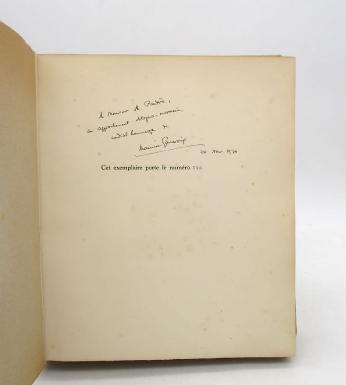 Édition illustrée des bois gravés de Soulas. Un des 950 exemplaires sur vélin teinté pur fil Lafuma. Cet exemplaire comporte un envoi auographe signé de l'auteur à A. Pradère, daté de 1934. Fermeture pour congés, TRAITEMENT DES COMMANDES SUPSENDU JUSQU'AU 29 DECEMBRE. * Membre du SLAM et de la LILA / ILAB Member. La librairie est ouverte du lundi au vendredi de 14h à 19h. Merci de nous prévenir avant de passer,certains de nos livres étant entreposés dans une réserve.