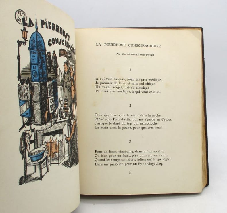 Paris, Au Luxembourg, s.d. (vers 1940). In-4 broché, non coupé, 214 p. Paroles des chansons et partitions. 53 illustrations coquines coloriées au pochoir de Morvan. Ouvrage à tirage limité, réservé aux seuls souscripteurs, et non mis dans le commerce. Livré avec 14 planches en couleurs signées Jacques Touchet, illustrant certaines chansons. Bon état.Avec "3 orfèvres, à la St Eloi", précédent ouvrage de l'auteur, constitue - selon ledit auteur - une "anthologie à peu près complète".