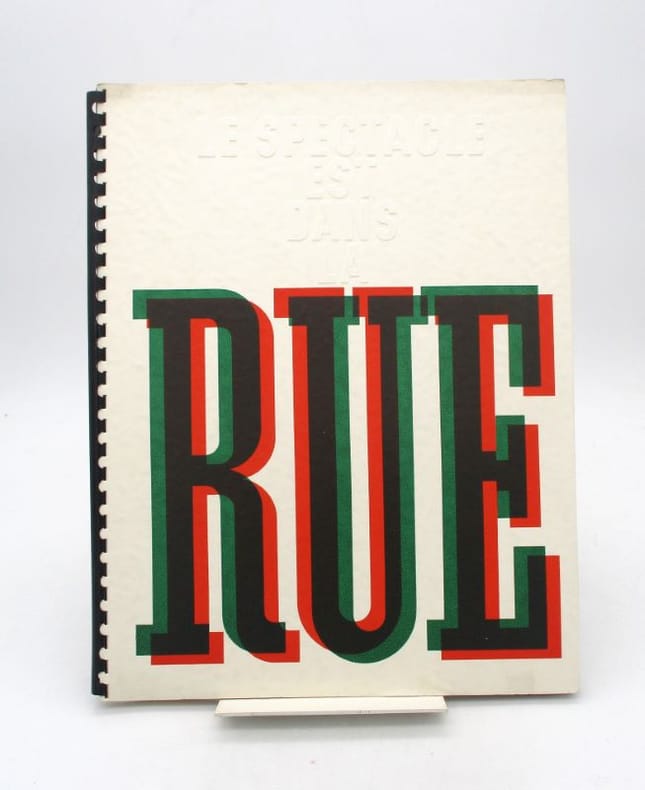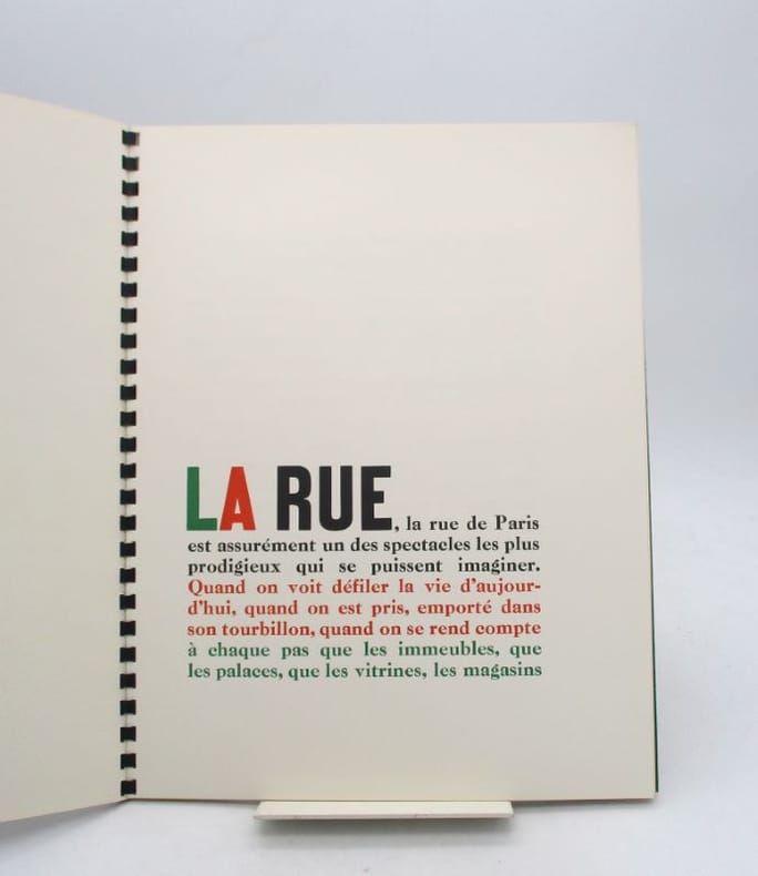 Paris Draeger, s.d. [1935] 1 vol. Broché in-4, reliure spirale, plats de papier crème avec sur le premier le début du titre gaufré et le mot "rue" imprimé en trois couleurs, vert noir et rouge, doublures vertes, gardes rouges, non paginé (40 pages). Superbe plaquette en hommage au grand affichiste Cassandre : 15 planches reproduites en noir et en couleurs accompagnées d'un texte de Cendrars en originale, dans une typographie virtuose, qui fait alterner le rouge, le vert et le noir, et joue sur la taille des caractères et la disposition du texte. Très belle réalisation, l'un des chefs-d'oeuvre de l'art publicitaire. Très légères marques de brunissure sur les plats, sinon exemplaire en excellente condition.