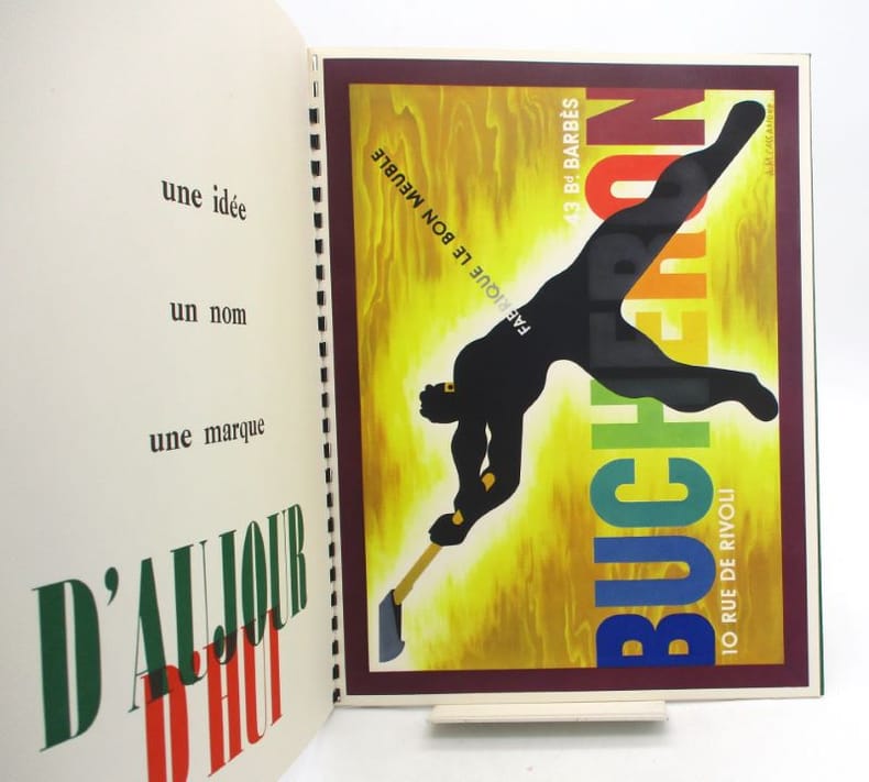 Montrouge Draeger 0 s.d. [1935]. In4, non paginé, reliure plastique SGDG, couverture blanche, titre en partie gaufré, en partie imprimé en rouge, noir, vert, dans une large typographie entretenant l'effet de relief - 15 affiches de A.M. Cassandre reproduites en noir et blanc ou en couleurs , introduction de Blaise Cendrars imprimée en vert, rouge et noir, pour le texte, beau travail typographique en 3 couleurs - Quelques rousseurs aux premiers feuillets et aux plats particulièrement au 4e . Recueil célèbre composé de la reproduction de 15 affiches, dont quatre en couleurs de l'artiste Cassandre, dont le texte de Cendrars fait l'éloge "... je lui suis reconnaissant d'avoir découvert dans la publicité la fleur de la vie contemporaine, [...] une affirmation d'optimisme et de santé, la plus chaleureuse manifestation de la vitalité des hommes d'aujourd'hui..." On y retrouve les plus célèbres de ses affiches : celle du Normandie ou de l'Étoile du Nord (grand prix de l'affiche de 1927) , "Au bûcheron" (primée à l'Exposition internationale des arts décoratifs), et encore l'affiche en trois partie pour Dubonnet. Sans doute une des plus belles publications publicitaires jamais réalisées.