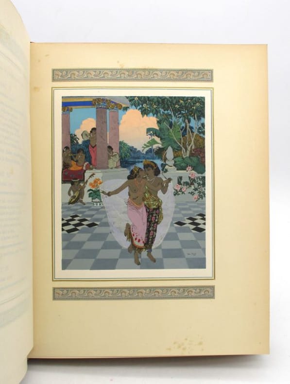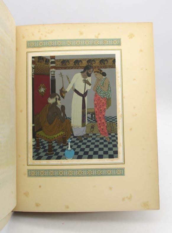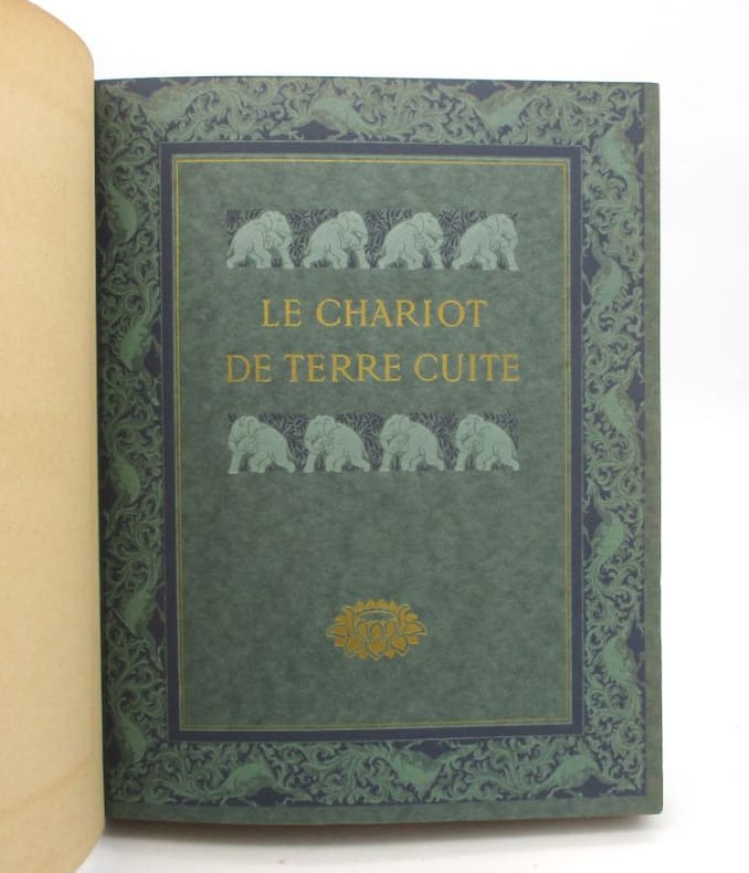 Édition illustrée de 19 compositions en couleurs par Léon Carré, à pleine page, sous serpentes légendées. 1 des 750 exemplaires numérotés sur vélin des manufactures Blanchet et Kléber.Texte imprimé en noir et vert sur fond beige, dans un encadrement en couleur. Bandeaux et ornementations en couleurs.Poitevin né en 1864 et mort en Algérie en 1934, Victor Barrucand présente dans sa préface cette pièce adaptée du sanscrit, qui fut jouée au Théâtre de l’Œuvre à Paris en 1895.