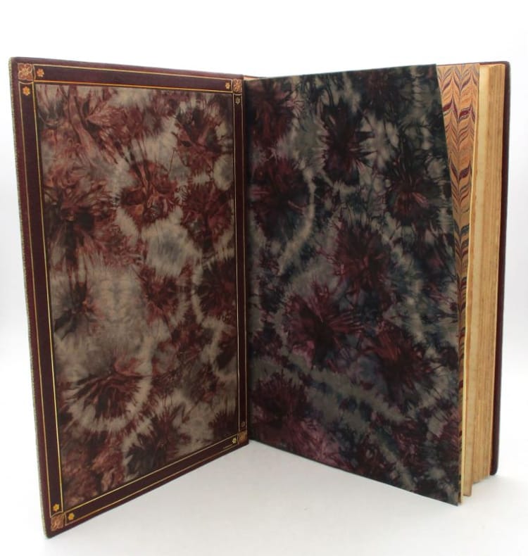 Paris, Éditions Lapina, 1926. 2 vol. in-folio, X-167 pp. + 173 à 379 pp., maroquin bordeaux de Berthet, filets dorés en encadrement sur les plats, les premiers plats mosaïqués veau blond estampés à froid représentant un vieil homme au premier volume et un homme en costume au second, les seconds mosaïqués d'une pièce triangulaire également estampée à froid, dos à nerfs orné de même, encadrement intérieur orné de filets et fleurons dorés, tête dorée, couverture conservée (petites épidermures, insolation, petites rousseurs, décharges).