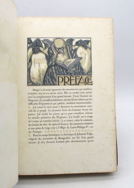 Edition originale, un des 125 exemplaires numérotés sur papier de Hollande (120), après 75 Japon. "Si L'Île des pingouins est une allégorie plus ou moins rationnelle qui peut se rattacher à la conjecture, son livre VIII et dernier brosse un tableau des révolutions successives, du capitalisme au collectivisme en passant par de nouveaux âges barbares, qui préfigurent les contre-utopies modernes." in Versins, p.349. Encyclopédie de l'Utopie, […].