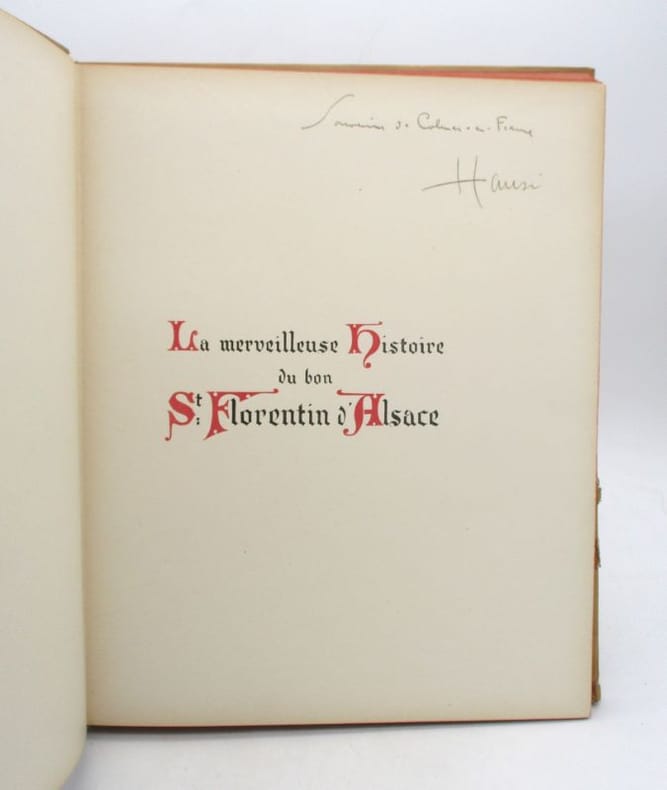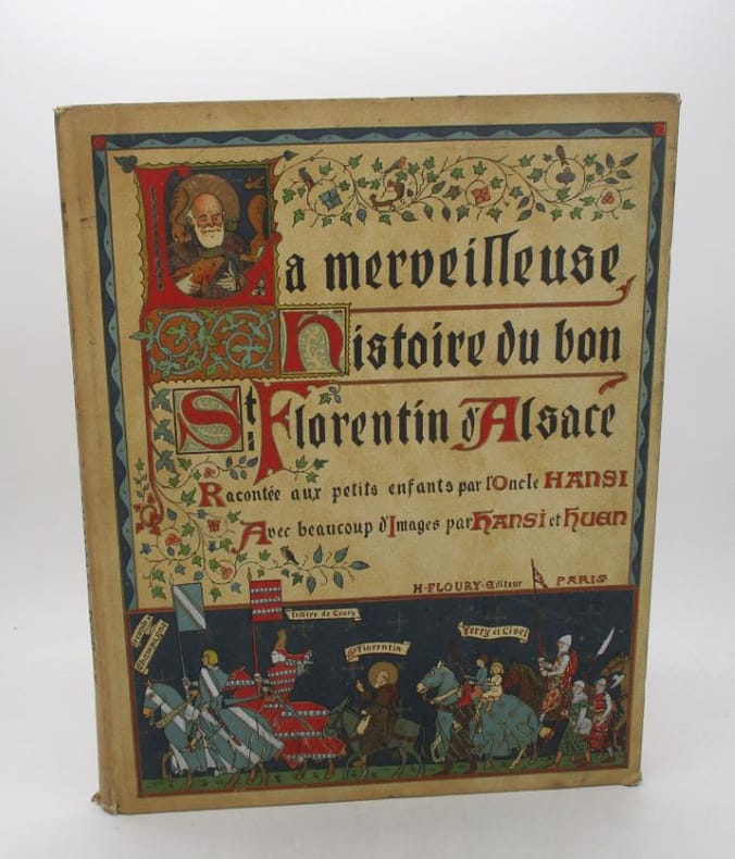 Hansi, (Jean-Jacques Waltz dit)La Merveilleuse Histoire du Bon St Florentin d'Alsace1925 Edition H. Floury, Paris, 1925. Grand in-4°, cartonnage éditeur illustré en couleurs, plats défraîchies, une discrète et légère restauration sur la première charnière (intérieure), intérieur frais. 76 pages, illustré en couleurs par Hansi et Victor Huen, hors-texte, coins émoussés, tranches brique bien réglées.