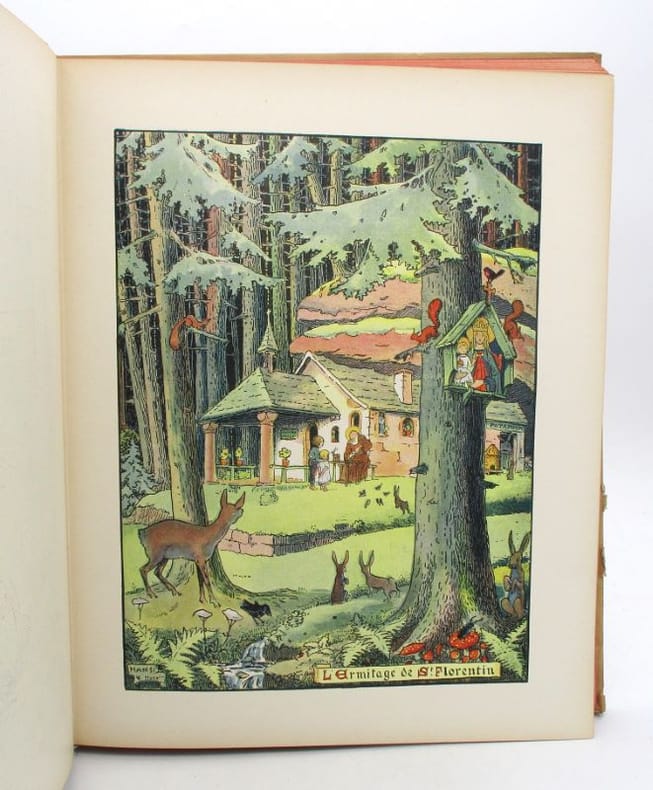 Cartonnage beige d'éditeur richement illustré en couleurs. Tranches rouges. Intérieur très frais.Edition entièrement illustrée dans le texte par Hansi et Huen contant l'histoire du bon Saint Florentin, sauveur des animaux, de Lisel et Yerri, de la belle Alsace, etc.