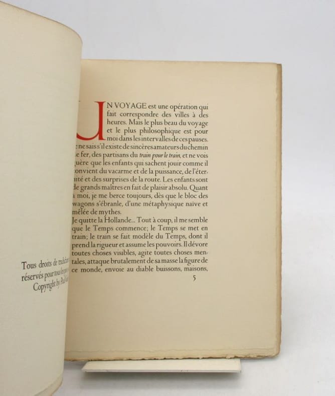 "Édition originale. Tirage limité à 400 exemplaires. Un des 25 numérotés sur Japon impérial (venant après 5 Japon à la forme) qui tous présentent 3 états supplémentaires du portrait (sur Japon, Hollande antique et Hollande); celui-ci n°VIII. Portrait-frontispice de Paul Valéry gravé sur bois par J. Franken Pzn. Vignette de couverture et de titre (ancre aldine au monogramme PV), lettrines de J. van Krimpen et marque d'imprimeur en rouge. Exemplaire à l'état de neuf. Karaïskakis et Chapon, Bibliographie des œuvres de PaulValéry, n° 71."