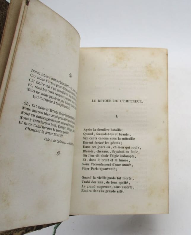 Édition réunissant : Lui. - Bounaberdi (Orientale). - Première Ode à la Colonne. - Souvenirs d'Enfance (l'Empereur au Panthéon). - Deuxième Ode à la Colonne. - Le grand Homme vaincu. - Napoléon II. - À Laure, duchesse d'Abrantès. - A l'Arc de Triomphe de l'Étoile. - Le 15 Décembre 1840. * Membre du SLAM et de la LILA / ILAB Member. La librairie est ouverte du lundi au vendredi de 14h à 19h. Merci de nous prévenir avant de passer,certains de nos livres étant entreposés dans une réserve.