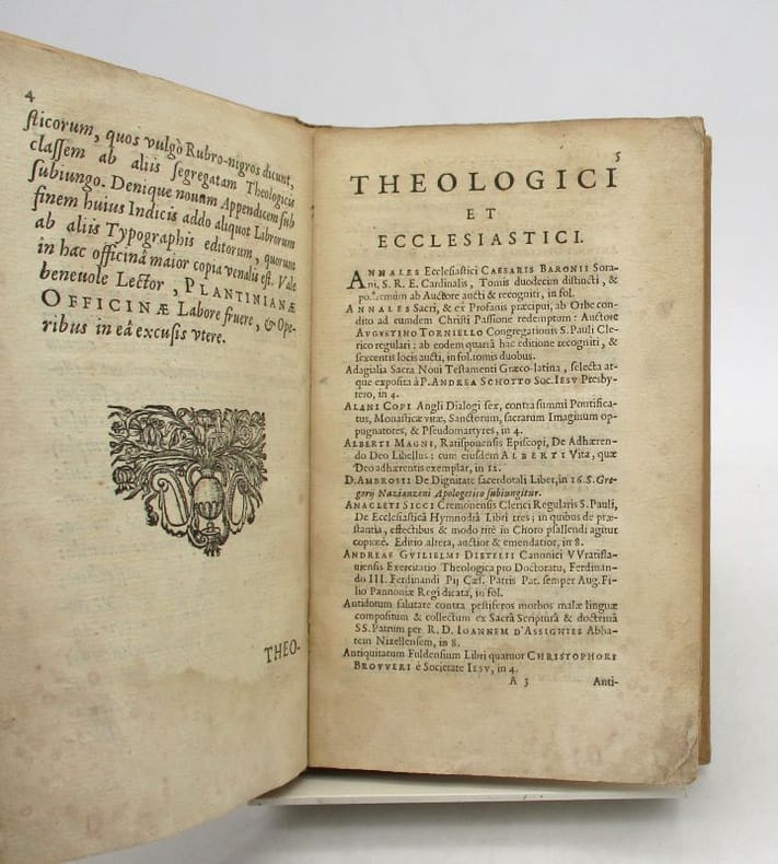 Édition originale du catalogue des livres édités par l'Imprimerie plantinienne, l'avant-dernier, comportant environ 700 titres sans prix. Il est orné d'une marque de l'imprimeur au titre. La partie consacrée aux ouvrages germaniques et flamands est imprimée en caractères gothiques. Plusieurs feuillets séparant les diverses catégories ne comportent que le titre et la pagination en tête, le tout sans manque. Ruelens, 40; Bigmore & Wyman p. 209. Ex-libris gravé d'Alfred Cortot, plusieurs C.A. au cours de l'ouvrage, un tampon illisible au titre. * Membre du SLAM et de la LILA / ILAB Member. La librairie est ouverte du lundi au vendredi de 14h à 19h. Merci de nous prévenir avant de passer,certains de nos livres étant entreposés dans une réserve.