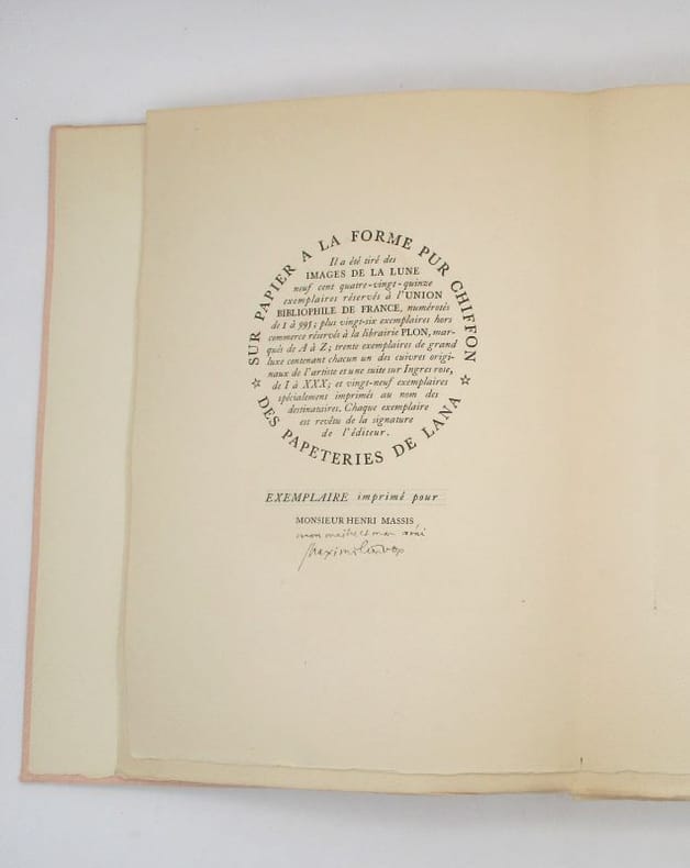 Édition illustrée des gravures à la manière noire d'Alexeieff. Un des 995 exemplaires réservés aux sociétaires de l'Union bibliophile de France, celui-ci comporte un envoi autographe signé de l'éditeur à Henri Massis, critique littéraire et journaliste. Ex-libris arrachés au premier contreplat. * Membre du SLAM et de la LILA / ILAB Member. La librairie est ouverte du lundi au vendredi de 14h à 19h. Merci de nous prévenir avant de passer,certains de nos livres étant entreposés dans une réserve.