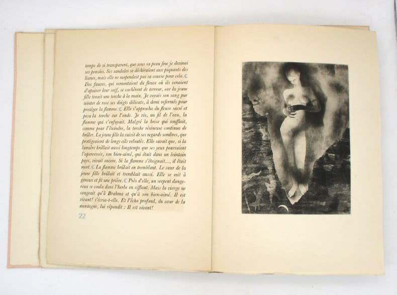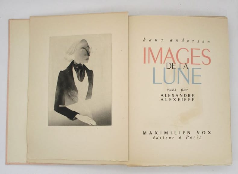 1942 Couverture souple Paris, Maximilien Vox, 1942. Un volume in-4 (34x24cm), en feuilles, couverture rose rempliée, chemise titrée grise cartonnée, dans son étui (légèrment passé). 152(6) pages, illustrées de 30 eaux fortes originales d'Alexandre Alexeïeff en bistre à pleine page, quelques décharges des illustrations sur la page en regard. Tirage limité à 1080 exemplaires, le nôtre un des 995 exemplaires numérotés sur papier pur chiffon à la forme, signé par l'éditeur Maximilien Vox. Un des plus beaux livres illustrés par le peintre et graveur d'origine russe Alexandre Alexeïeff (1901-1982). Ses eaux-fortes offrent une interprétation moderne et singulière du texte d'Andersen, utilisant un style souvent sombre, onirique et texturé, typique de son travail de graveur. Ouvrage soigneusement composé par Maximilien Vox, avec des ornements typographiques spécialement exécutés pour cet ouvrage et imprimés en rose et bleu. Bon état des planches, bon exemplaire.