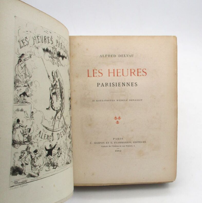 Avec 25 eaux fortes de Emile Benassit, dont celle de minuit (avec l'angelot). Envoi de 'auteur à Paul Dalloz en première page, reliure signée Lortic frères. En fin d'ouvrage, appendices aux heures parisiennes, avec un portrait de Delvau à l'eau forte par Valentin, : histoire du livre des heures parisiennes, reproduction de 3 lettres de Delvau, réimpression des textes supprimés par la censure avec le texte substitué en vis à vis (librairie centrale, 1872, 46p.)