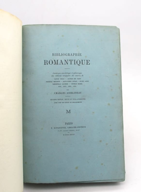 Troisième édition augmentée d'un appendice et de tables, eau-forte de Bracquemond, 1 vol. in-8 reliure de l'époque demi-chagrin vert, dos à 4 nerfs doré (fleurons en caissons), P. Rouquette, Paris, 1874, 2 ff., XXXII-335 pp.Rappel du titre complet : Bibliographie Romantique. Catalogue anecdotique et pittoresque des éditions originales des oeuvres de Victor Hugo - Alfred de Vigny - Prosper Mérimée - Alexandre Dumas - Jules Janin - Théophile Gautier - Pétrus Borel, etc. etc.