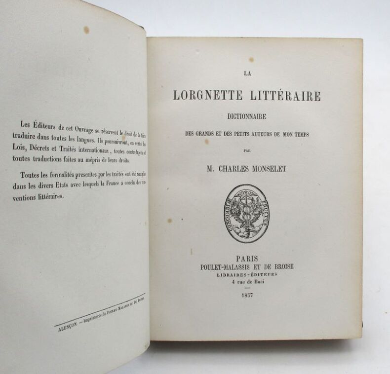 Paris, Poulet-Malassis et de Broise, Paris, Poulet-Malassis et de Broise1857 ; in-12 carré, broché. 2 ff., XVIII pp., 240 pp. - [Imprimé à Alençon]EDITION ORIGINALE tirée à 1500 exemplaires et 30 exemplaires sur Hollande.La Lorgnette fit grand bruit, déjà au cours de sa publication “pré-originale” dans la Gazette de Paris. D’ailleurs Monselet et Malassis retranchèrent un certain nombre de notices pour la publication en volume. Saluons ici le courage de Malassis, car le manuscrit avait été refusé par Bourdilliat (Librairie nouvelle) qui l’avait trouvé trop audacieux. “Monselet offrit alors son livre-épouvantail à un éditeur, son ancien ami, M. Poulet-Malassis, homme qui se distinguait essentiellement de Panurge par un goût immodéré du risque” (notice dans le Complément de la Lorgnette publié par Pincebourde en 1870). Malassis avait proposé un autre titre pour cette galerie : La Fosse commune, dictionnaire des grands et petits auteurs de mon temps. Sur plusieurs publications de Malassis l’ouvrage fut ainsi annoncé.Dans ses Lettres satiriques et critiques, Babou a fort heureusement décrit l’esprit et la nouveauté qui règnent ici : “Il manquait sans doute, à la presse du XIX° siècle quelque chose de ce que Théodore de Banville laissa pailleter dans ses vers, lorsqu’en un jour de gaité il emmancha sa plume dans une batte d’Arlequin.Après la poèsie-bouffe et les odes funambulesques, il était bien naturel de s’attendre à de la prose funambulesque, à la critique-bouffe, à de l’esthétique mêlée de soufflets, gambades, ruades et pirouettes. Cette prose, cette critique, cette esthétique, vous avez jovialement tenté de nous la donner, dans votre Abecedario littéraire”.Launay 35 - A. Monselet 27 - Talvart et Place 18 A 1 - Vicaire V 1039 - Clouzot 120 - Carteret II 175Exemplaire sur papier d’édition. La couverture imprimée en beige porte en quatrième des publicités et des annonces de livres en préparation. Quelques rousseurs.