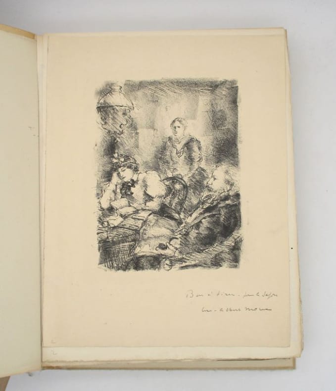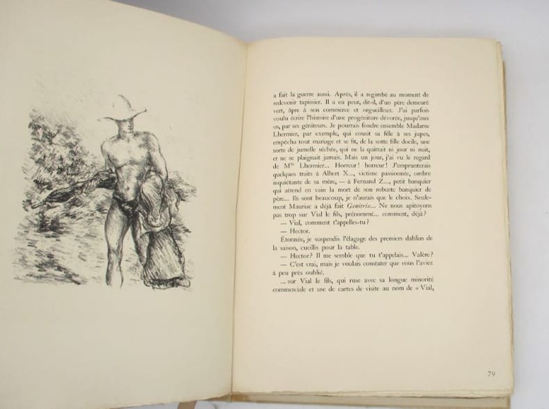 Édition illustrée des lithographies de Moreau. Un des 60 sur vélin pur chiffon des manufactures de Vidalon, celui-ci comporte un envoi autographe signé de l'auteur et de l'artiste à Renée Chaine. Cet exemplaire est enrichi d'un calque, d'un bon à tirer signé par l'artiste en deux états (un sur vélin et un sur Japon), une gravure signée et un 2e état de la vignette de titre tiré sur Japon. * Membre du SLAM et de la LILA / ILAB Member. La librairie est ouverte du lundi au vendredi de 14h à 19h. Merci de nous prévenir avant de passer,certains de nos livres étant entreposés dans une réserve.