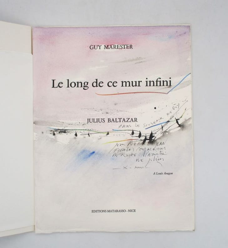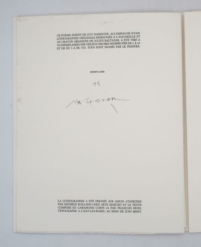 Nice Editions Matarasso juin 2006 In-4, en feuilles, couverture imprimée.Edition originale de ce poème illustré par Julius Baltazar dune lithographie originale hors texte rehaussée à laquarelle et au crayon arlequin, imprimée sur japon Atsukushi et contrecollée. Tirage unique limité à 50 exemplaires numérotés sur vélin dArches, signés par lartiste.