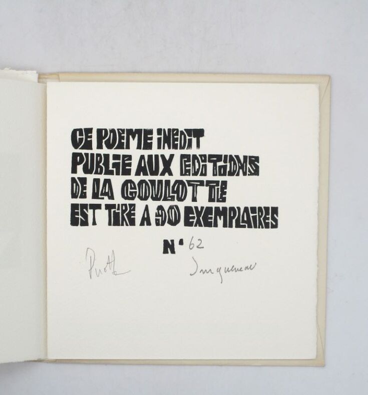 Édition originale illustrée des compostions en noir de Jean-Marie Queneau. Un des 90 exemplaires, seul tirage annoncé, celui-ci comporte un envoi autographe signé de Jean-Marie Queneau à l'artiste Jean Cortot. * Membre du SLAM et de la LILA / ILAB Member. La librairie est ouverte du lundi au vendredi de 14h à 19h. Merci de nous prévenir avant de passer,certains de nos livres étant entreposés dans une réserve.