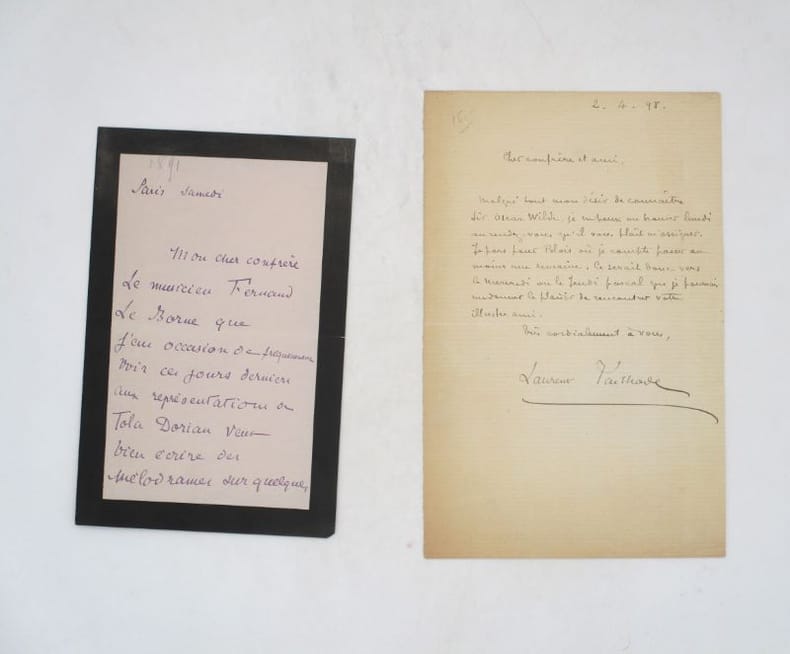 1- Lettre autographe signée à un confrère à propos de la mise en musique de vers de l'auteur par Fernand Le Borne, compositeur et critique musical belge dont il évoque l'oeuvre intitulée Tola Dorian (Paris, samedi [1891].In-12, 2 pp.) 2 - Lettre autographe signée à un confrère relative à une rencontre avec Oscar Wilde, quelques années après qu'il en ait pris la défense suite à sa condamnation pour homosexualité (S.l., 2 mars 1898. In-8, 1 p.) * Membre du SLAM et de la LILA / ILAB Member. La librairie est ouverte du lundi au vendredi de 14h à 19h. Merci de nous prévenir avant de passer,certains de nos livres étant entreposés dans une réserve.