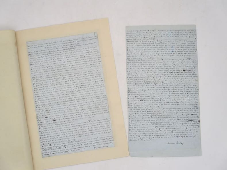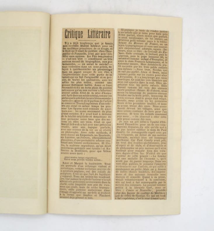 Réunion de deux manuscrits autographes signés comportant quelques corrections autographes de chroniques littéraires rédigées par Armand Silvestre. La première, concernant Marcel Schwob, Paul Courty, Georges Montorgueil ou encore Montesquiou ,est contrecollée sur feuillet. On joint l'article publié le 13 juin 1896. Le seconde évoque les lectures de vacances de Silvestre : Louis Fabulet, Cardeline ou encore Edmond Picard. * Membre du SLAM et de la LILA / ILAB Member. La librairie est ouverte du lundi au vendredi de 14h à 19h. Merci de nous prévenir avant de passer,certains de nos livres étant entreposés dans une réserve.