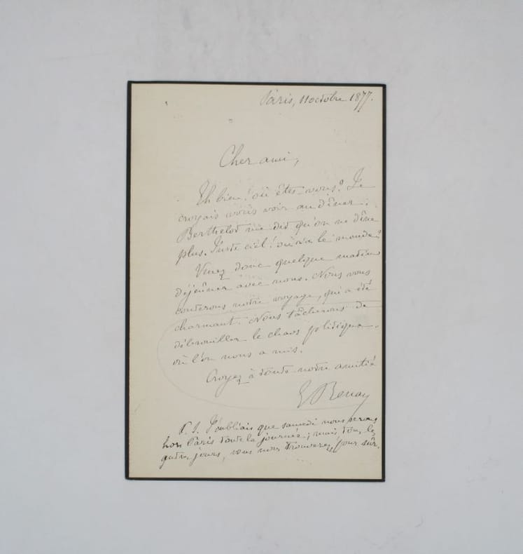 Lettre autographe signée à un destinataire non identifié. Renan y évoque le "chaos politique" dans lequel il se trouve. * Membre du SLAM et de la LILA / ILAB Member. La librairie est ouverte du lundi au vendredi de 14h à 19h. Merci de nous prévenir avant de passer,certains de nos livres étant entreposés dans une réserve.