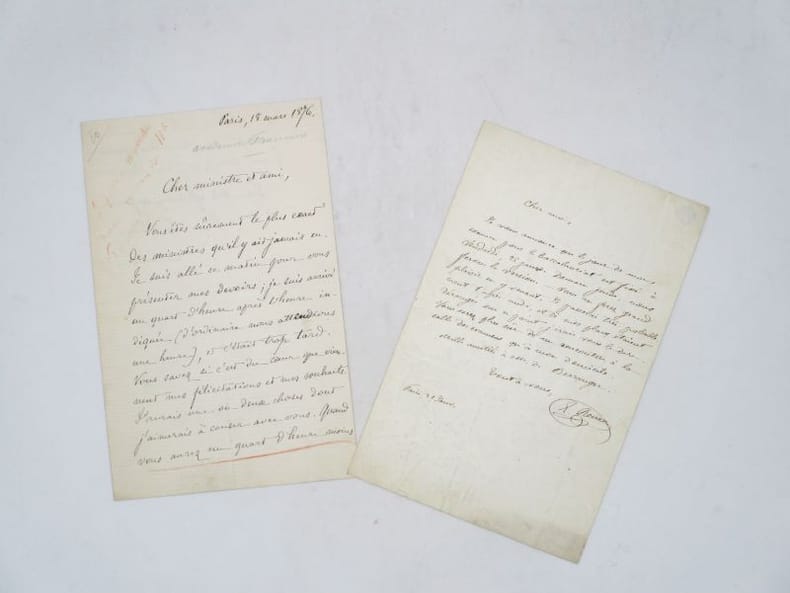 2 lettres autographes signées : 1- Paris, 18 mars 1876. In-8, 1 1/2 pp. Renan explique à un "cher ministre et ami" qu'il a essayé de venir le voir sans succès. 2- Paris, 21 janvier. In-8, 1 p. Il évoque le baccalauréat et l'enseignement (feuillet froissé). * Membre du SLAM et de la LILA / ILAB Member. La librairie est ouverte du lundi au vendredi de 14h à 19h. Merci de nous prévenir avant de passer,certains de nos livres étant entreposés dans une réserve.