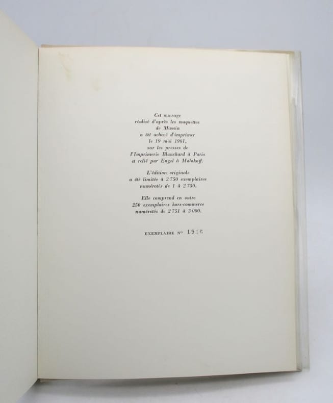 Édition originale réalisée d'après la maquette de Massin avec achevé d'imprimer du 19 mai 1961. Un des 2750 exemplaires mis dans le commerce. * Membre du SLAM et de la LILA / ILAB Member. La librairie est ouverte du lundi au vendredi de 14h à 19h. Merci de nous prévenir avant de passer,certains de nos livres étant entreposés dans une réserve.