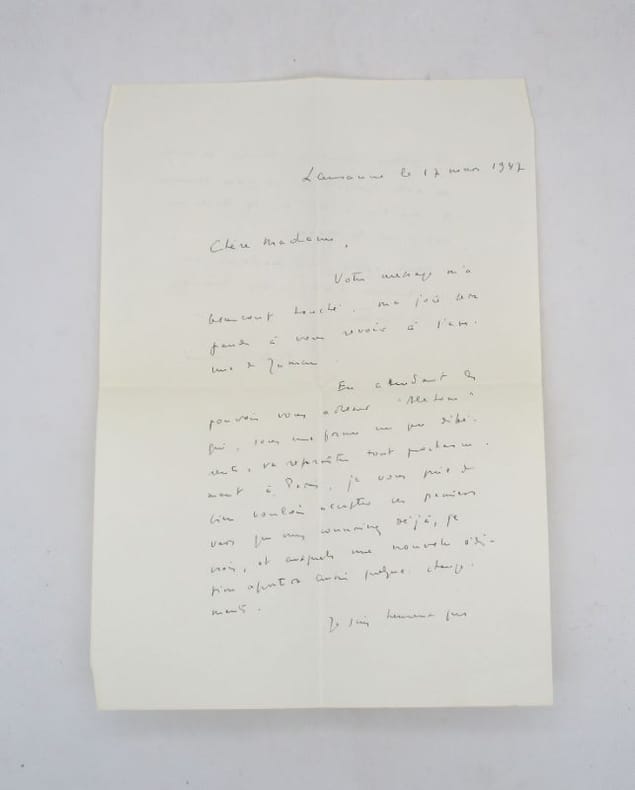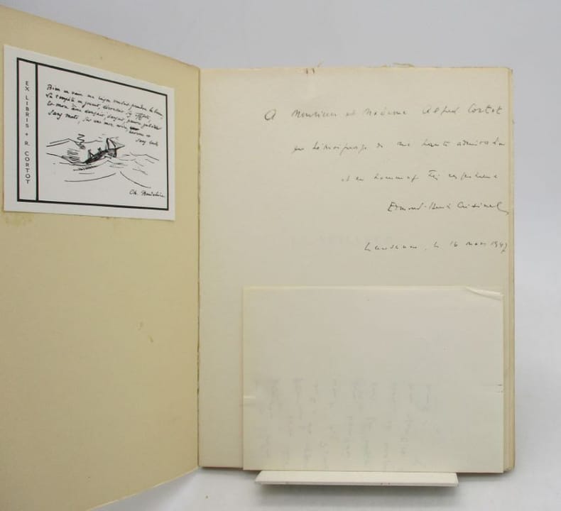 Édition originale de ce recueil orné d'un portrait de l'auteur en frontispice. Un des 250 exemplaires sur vélin crème, celui-ci comporte un envoi autographe signé de l'auteur à Alfred Cortot et une lettre autographe signé de l'auteur (Lausanne, 17 mars 1947. In-4, 2 pp.). Ex-libris gravé de R. Cortot. * Membre du SLAM et de la LILA / ILAB Member. La librairie est ouverte du lundi au vendredi de 14h à 19h. Merci de nous prévenir avant de passer,certains de nos livres étant entreposés dans une réserve.
