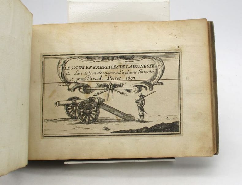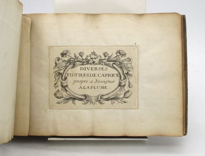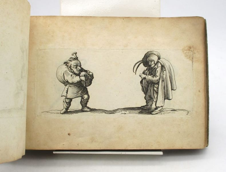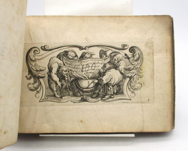 Recueil factice de gravures comprenant : 1-Diverses figures grotesques inventées par Jacques Callot. Paris, H. Bonnart, [XVIIe siècle]. 6 planches dont titre gravé. 2- Divers postures désignée et gravée par Callot. Paris, F. Gérard, 1686. 6 planches dont titre gravé. 3- Les Nobles Exercices de la jeunesse ou l'Art de bien dessigner à la plume inventée et gravées par A. Poiret. S.l., s.n., 1697. 2 planches dont titre. 4- Divers figures de caprice propre à dessugner à la plume. 26 planches dont titre. Certaines de ces gravures ont été découpées et contrecollées sur des feuillets. Ex-libris manuscrits Marguerite Robert et Picard. * Membre du SLAM et de la LILA / ILAB Member. La librairie est ouverte du lundi au vendredi de 14h à 19h. Merci de nous prévenir avant de passer,certains de nos livres étant entreposés dans une réserve.