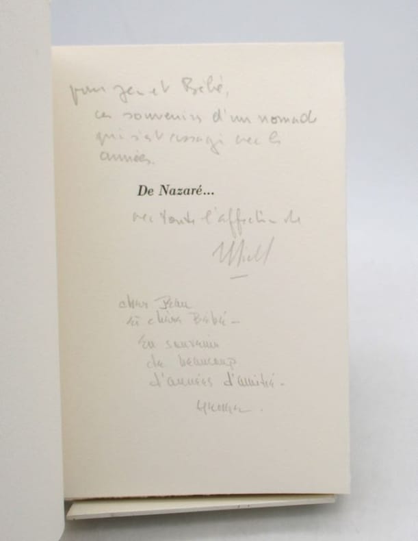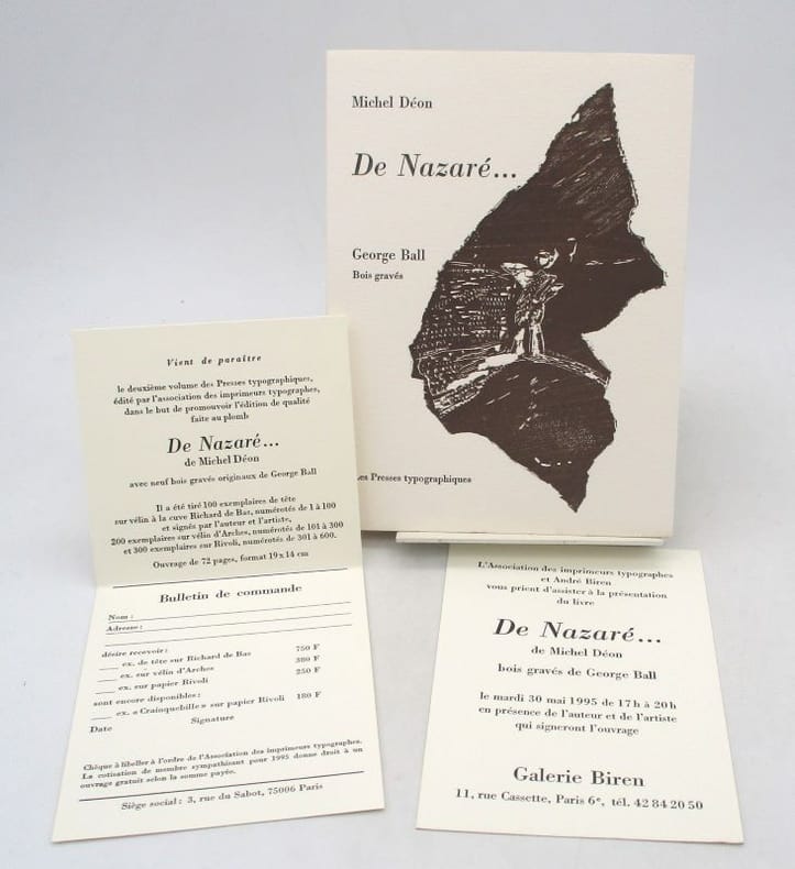Paris Les Presses Typograp 1995 Petit in-8, en feuilles, couverture illustrée.9 bois originaux par George Ball dont un sur la couverture, 5 hors-texte (un sur double page) et 3 in-texte avec une préface inédite de Michel Déon. Tirage limité à 600 exemplaires numérotés. Un des 100 premiers exemplaires sur vélin Richard de Bas, seuls à être signés par l'auteur et l'artiste. Exemplaire portant sur le faux titre cet envoi autographe signé de l'auteur au couple relieur Miguet: pour Jean-Paul et Colette, avec toute mon affectueuse reconnaissance, ces images De Nazaré et des Baléares, souvenirs de mon Europe vagabonde. Michel Déon. Cet envoi est accompagné par ce petit mot autographe de l'artiste: Bien amicalement, George Ball. Est jointe la carte d'invitation pour la présentation du livre qui a eu lieu à la Galerie Biren le 30 mai 1995.