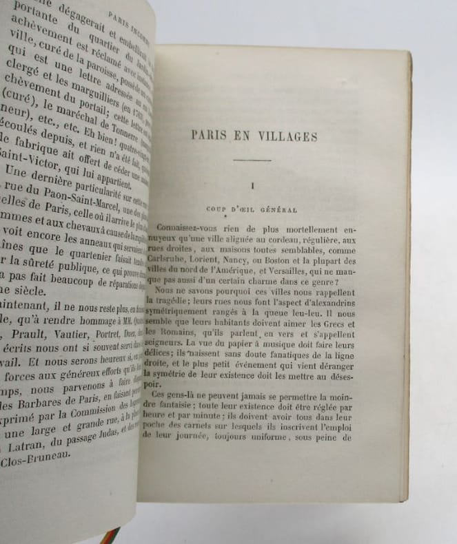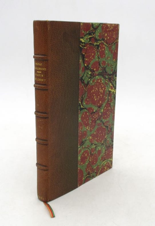 1 vol. in-12 reliure de l'époque demi-chagrin brun, dos à 5 nerfs, Adolphe Delahays, Paris, 1861, 283 pp. Rappel du titre complet : Paris Inconnu [ Edition originale] [ Contient : ] Portraits et caractères — Le Cloître Saint-Jean de Latran — Le Camp des barbares — Rues Traversine et Clos Bruneau — Paris en villages — Peintures d'histoire, portraits et paysages — Le Faubourg Saint-Jacques — L'Épicerie et le théâtre — La Légende de l'épicier, auteur dramatique — Un parfait épicier — Le Cultivateur en chambre — Esquisses parisiennes — Le Marché aux journaux — Les Crieurs (souvenirs de 1848) — Un Ami trop bon enfant — L'Œil sans paupières et la langue des On. — Nouvelles — Histoire d'une chemise — Les Singes de Dieu et les hommes du diable — Théâtre — M. Poupard — Articles divers — Lettres — Poésies.