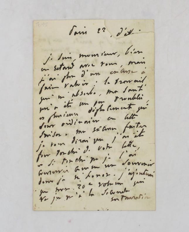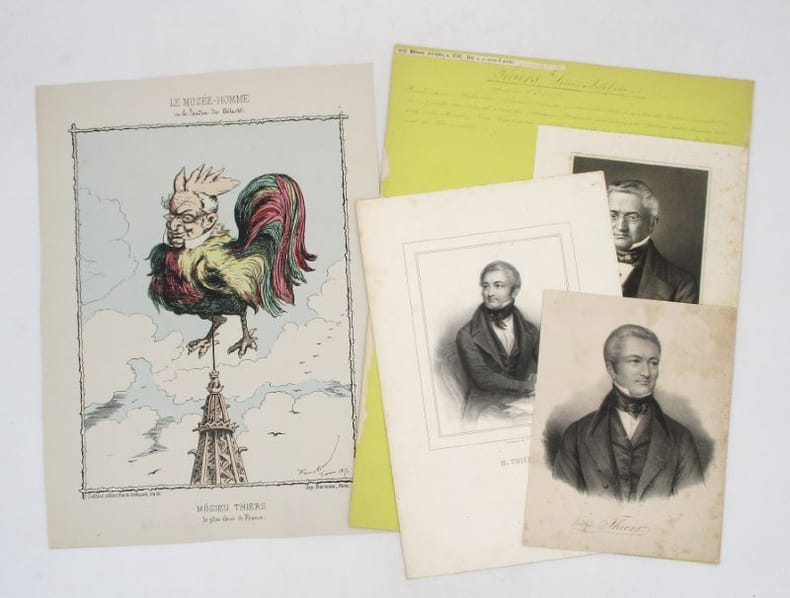 Lettre autographe signée à un destinataire non identifié auquel il confie ses ennuis de santé et son absorption par le travail. Il mentionne un 20e volume en cours d'une monographie historique s'arrêtant à la seconde restauration (soit à Louis XVIII), sans doute de son ouvrage Révolution, l'Histoire du Consulat et de l'Empire dont le dernier volume paraît en 1862. On joint une caricature imprimée en couleurs provenant de la série "Musée-Homme" de Faustin et trois portraits officiels de Thiers. * Membre du SLAM et de la LILA / ILAB Member. La librairie est ouverte du lundi au vendredi de 14h à 19h. Merci de nous prévenir avant de passer,certains de nos livres étant entreposés dans une réserve.