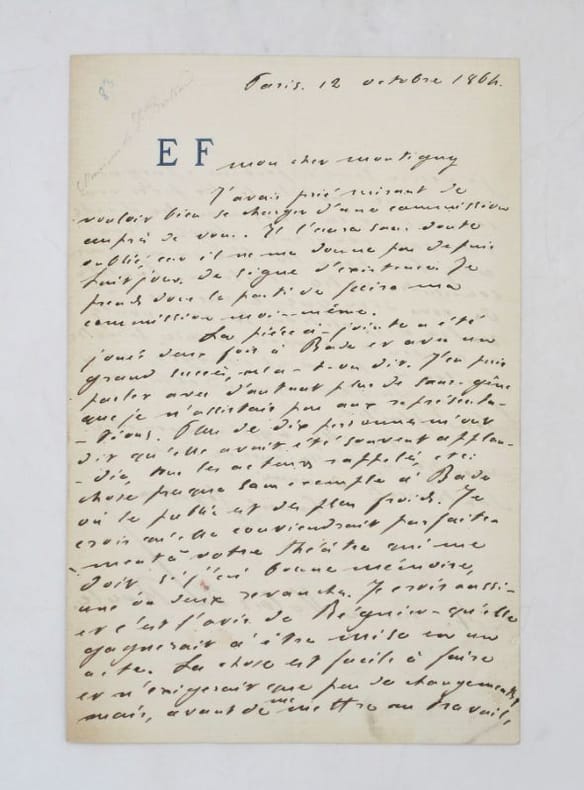Lettre autographe signée à "Mon Cher Montigny" [peut-être Adolphe Lemoine-Montigny, directeur du théâtre du Gymnase] à qui il propose une pièce. * Membre du SLAM et de la LILA / ILAB Member. La librairie est ouverte du lundi au vendredi de 14h à 19h. Merci de nous prévenir avant de passer,certains de nos livres étant entreposés dans une réserve.