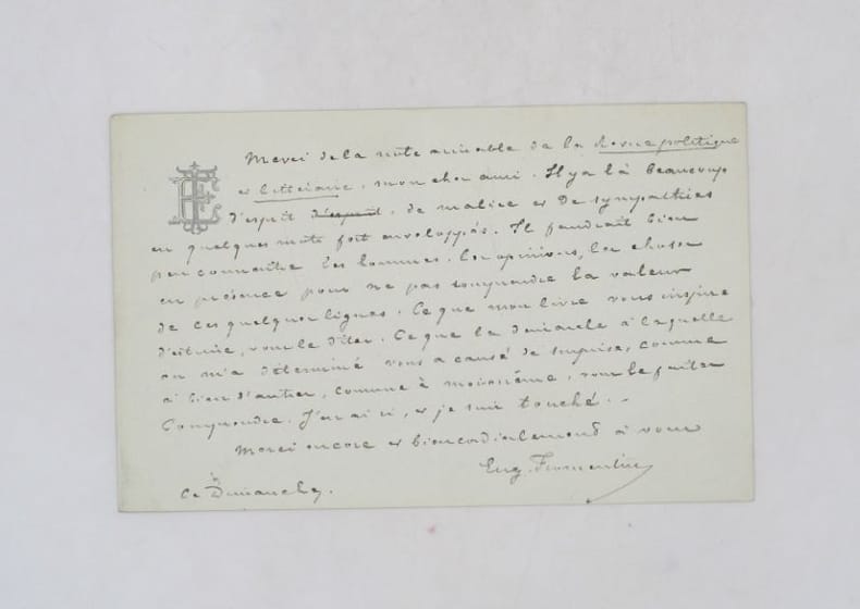 Lettre autographe signée à un destinataire non identifié qu'il remercie d'une note dans la Revue politique et littéraire. * Membre du SLAM et de la LILA / ILAB Member. La librairie est ouverte du lundi au vendredi de 14h à 19h. Merci de nous prévenir avant de passer,certains de nos livres étant entreposés dans une réserve.