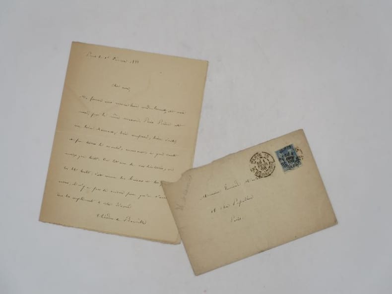 [ 3 L.A.S. adressées à Mlle Simone Arnaud Delage ] Lettre autographe signée de Camille Doucet, de l'Académie Française, 1 page à en-tête de l'Institut de France sous enveloppe marquée "Académie Française", datée du 25 mai 1885 : "Mademoiselle et chère confrère, Rien de plus touchant et de plus dramatique que votre Roche "Mengan", j'en suis encore tout ému & je m'empresse de joindre mes très sincères compliments aux remerciements que je vous dois pour votre bon et gracieux souvenir" ; Lettre autographe signée de Georges Monval, Bibliothécaire Archiviste de la Comédie Française, datée du 12 février 1883, 1 page sous enveloppe : "Mademoiselle, J'ai l'honneur de vous informer que, dans sa séance du 8 février, le Comité d'Administration du Théâtre Français a pris connaissance du rapport fait par la Commission d'examen sur votre comédie : "Mademoiselle du Vigean". J'ai en même temps le plaisir de vous annoncer que le Comité, s'associant aux conclusions de ce rapport, a réservé votre ouvrage pour l'envoyer devant le Comité de Lecture" ; Lettre autographe signée d'Albert Delpit, 4 pages sous enveloppe : "Mademoiselle, j'irai vous voir demain. [ ... ] Il est fort possible que je ne sois pas libre à 4 h ; mais plus tard. Et j'ai besoin de vous voir car j'ai des conseils importants à vous donner sur Jane Grey. Voulez-vous que nous admettions ceci ? Si vous ne receviez rien de moi, demain avant midi, c'est que j'irai rue St Pétersbourg [ ... ]