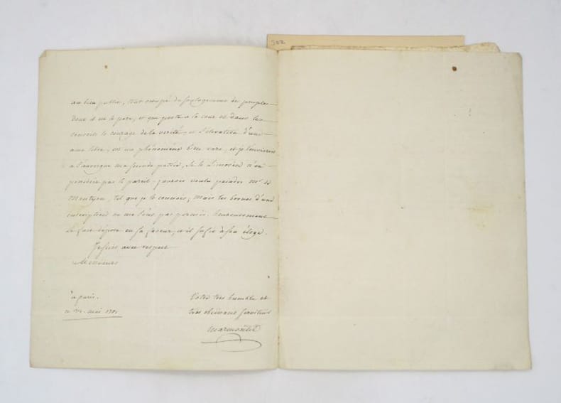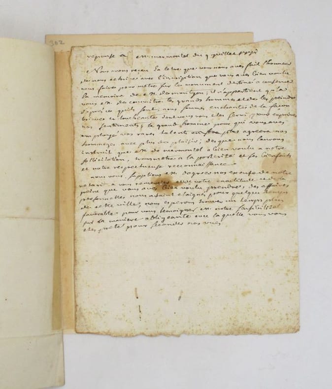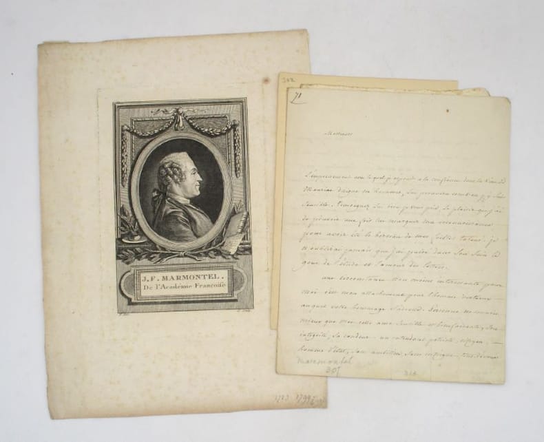 Lettre autographe signée à un destinataire non identifié qu'il entretient d'un monument en hommage à Montyon commandé par la ville de Mauriac. On joint le brouillon de la réponse à Marmontel et un portrait gravé de l'auteur. * Membre du SLAM et de la LILA / ILAB Member. La librairie est ouverte du lundi au vendredi de 14h à 19h. Merci de nous prévenir avant de passer,certains de nos livres étant entreposés dans une réserve.