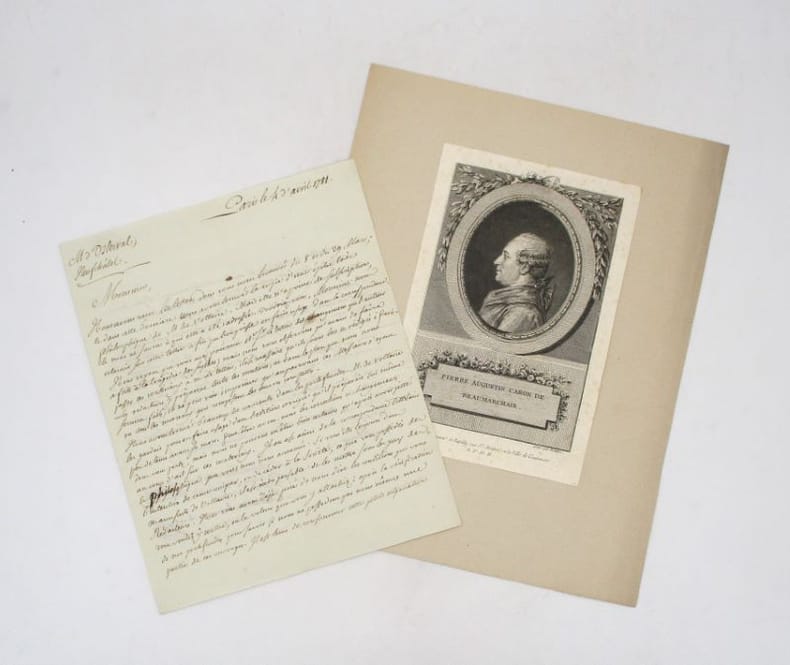 Lettre allographe signée à Jean-Frédéric Ostervald qui possède des manuscrits de Voltaire que Beaumarchais souhaite se procurer pour faire une édition de sa correspondance par la Société littéraire typographique, maison d'édition fondée par Beaumarchais et Condorcet pour l'impression de ses oeuvres complètes, à Khel. On joint un portrait de l'auteur. * Membre du SLAM et de la LILA / ILAB Member. La librairie est ouverte du lundi au vendredi de 14h à 19h. Merci de nous prévenir avant de passer,certains de nos livres étant entreposés dans une réserve.