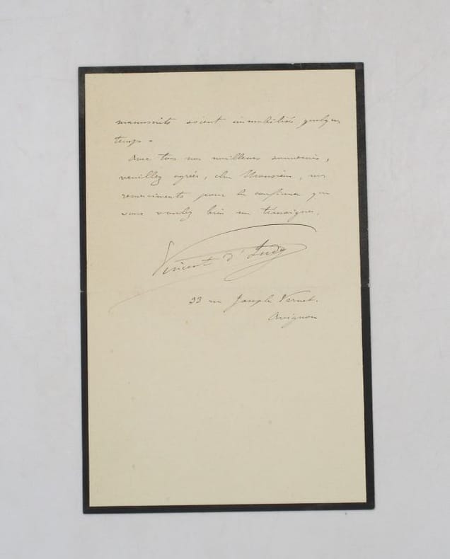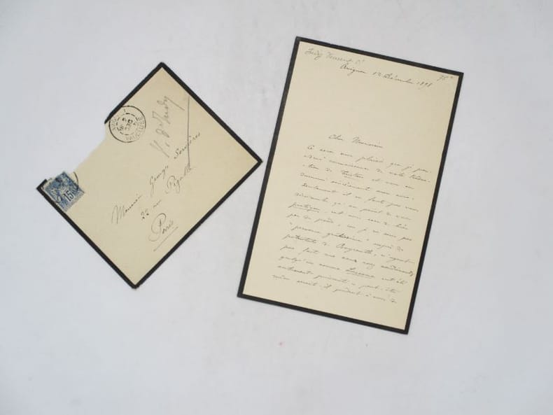 Lettre autographe signée de Félix Fénéon adressée à Gabriel Mourey, 18 lignes à l'encre noire, traces de pliure inhérentes à la mise sous pli de la lettre. Témoin et acteur privilégié de son époque, le critique d'art et collectionneur Félix Fénéon aide l'auteur Gabriel Mourey dans sa quête pourretrouver la correspondance de Paul Adam avec Maurice Barrès : "Le romancier et occultiste Paul Adam fut, comme vous savez, très lié à Maurice Barrès. (Candidats boulangistes dans deux circonscriptions lorraines contiguës, il firent fraternellement une campagne électorale et journalistique à laquelle leur amitié ne survécut guère.)Comment retrouver tous les papiers de Paul Adam, mort il y a une vingtaine d'années ? Mme Paul Adam vit-elle encore. - je n'en sais rien. Mais il est probable que vive une de ses soeurs, veuve depuis quelques trois ans de ce L. Cappielloauteur de tant d'affiches, - peintre elle aussi (et, de plus, fort sourde). Leur demeure était 8 rue Lechatelier, XVIIe. Par Mme L. Cappiello vous retrouverez peut-être des papiers barrésiens laissés par Paul Adam. Pour le cas où vous chercheriez dans cette direction, je note que que j'ai été en excellents termes avec toute la famille et que vous pouvez donc user de mon nom à votre gré." Personnalité majeure de l'Avant-garde, Fénéon avait le talent de débusquer les plus grands artistes. Cet étrange dandy volontairement discret, fit le vude servir quasi religieusement tout ce qui dans l'art forme une nouvelle sensibilité.Défenseur des néo-impressionnistes Seurat et Signac, ami de Mallarmé et de Camille Pissaro, de Paul Adam, Gustave Kahn, anarchiste puis communiste, directeur d'une douzaine de petites revues, il publia des uvres neuves telles les Illuminationsde Rimbaud, lePaludesd'André Gide,Dédalusde James Joyce. Prolifique journaliste, il écrivit partout et ne signa pas ses articles ou emprunta même des pseudonymes extravagants comme Gil de Bache, Porphyre Kalouguine, voire Thérèse ou Louise. Rare lettre de Félix Fénéon sur ses contemporains. Nous y joignions une lettre autographe signée de Fanny Fénéon, femme de Félix Fénéon, datée du 30 décembre 1941 alors que son mari était malade et alité, 10 lignes à l'encre noire, traces de pliure inhérentes à la mise sous pli de la lettre. "Mon mari gravement malade est dans l'impossibilité de recevoir quelqu'un. Si la difficultéque vous désirez lui remettre peut se résoudre par lettre, veuillez lui dire ce dont il s'agit. Une réponse immédiate vous montrera que malgré ses 80 ans, il est tout à votre disposition. [...]" - Photographies et détails sur www.Edition-Originale.com -