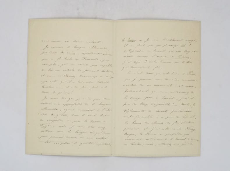Lettre autographe signée à Georges Servières, un critique musical, qui lui a envoyé une traduction de Tristan de Wagner. Il lui conseille de se tourner vers Lascaux, plus introduit à Bayreuth où lui-même n'est pas admis pour n'avoir pas fait sa cour assez "assidument" à ses "potentats". Il évoque la traduction par Fourcaud de cette même pièce ainsi que ses tournées à venir en France. * Membre du SLAM et de la LILA / ILAB Member. La librairie est ouverte du lundi au vendredi de 14h à 19h. Merci de nous prévenir avant de passer,certains de nos livres étant entreposés dans une réserve.