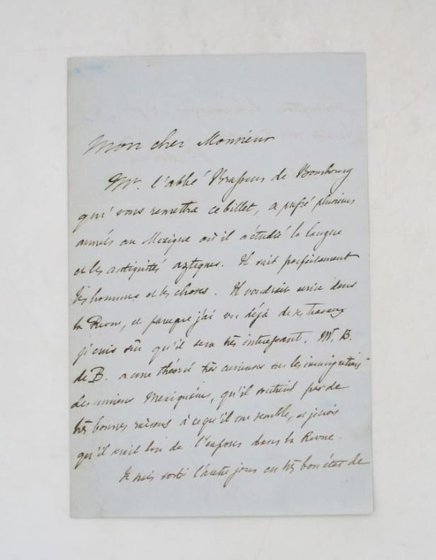 Lettre autographe signée à François Buloz, patron de presse français à qui il recommande l'abbé Brasseur de Bourbourg, pionnier des études précolombiennes. * Membre du SLAM et de la LILA / ILAB Member. La librairie est ouverte du lundi au vendredi de 14h à 19h. Merci de nous prévenir avant de passer,certains de nos livres étant entreposés dans une réserve.