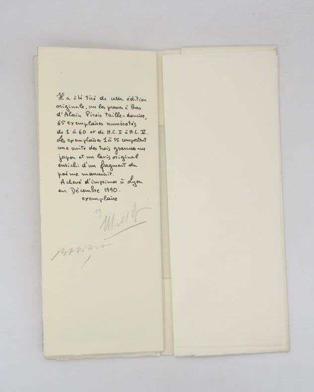 Lyon, Alain Pirois, 1990. In-8 étroit, non paginé, en feuilles, couverture originale illustrée (infimes rousseurs éparses sur la couverture).