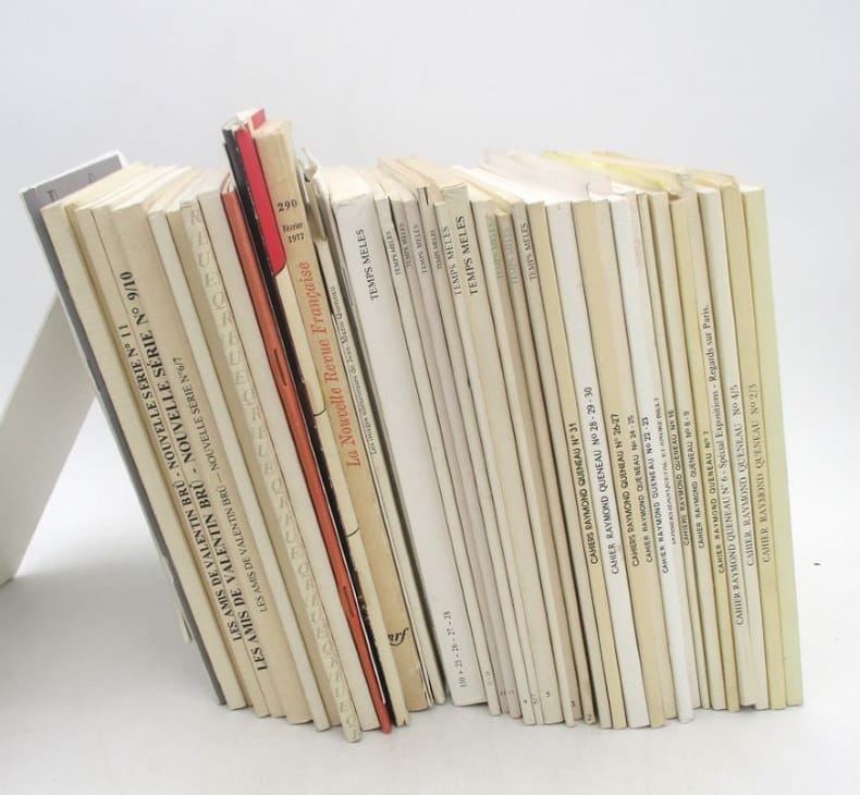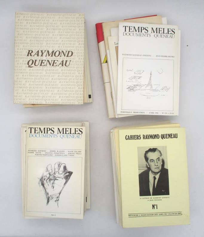 13 numéros des Cahiers Raymond Queneau : 1-9, 16, 20-31. 14 numéros Documents Queneau des Temps mêlés : 1-7, 9, 11-14, 25-32, 149-150. 7 numéros de la revue publiée par Les Amis de Valentin Bru : 2, 6/7, 9/10 et 11 de la nouvelle série, II de 1984, IV de 1985, 13/14 et 28/29. 3 catalogues d'expositions. Le numéro 5 de septembre 2004 de Queskispass. Le numéro 12 d'Entracte du mois. Le numéro 290 de la NRF de février 1977. Certains comportent des envois, des lettres ou billets autographes de Jean-Marie Queneau ainsi que des invitations à des vernissages ou lancements de publication, des affiches... Nombreuses illustrations. * Membre du SLAM et de la LILA / ILAB Member. La librairie est ouverte du lundi au vendredi de 14h à 19h. Merci de nous prévenir avant de passer,certains de nos livres étant entreposés dans une réserve.