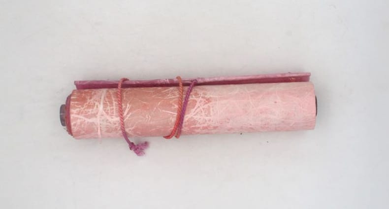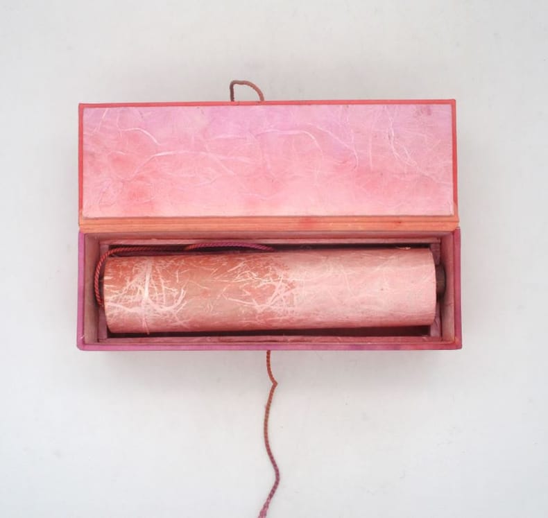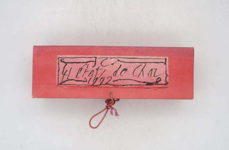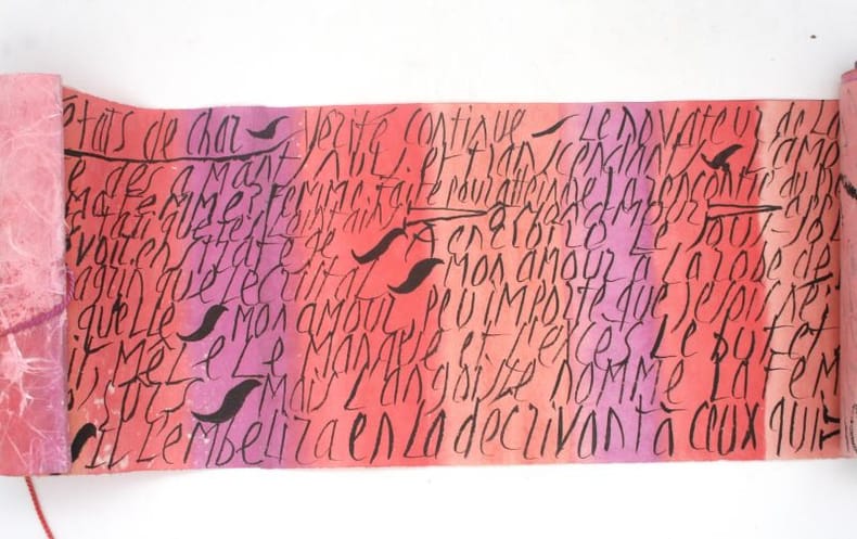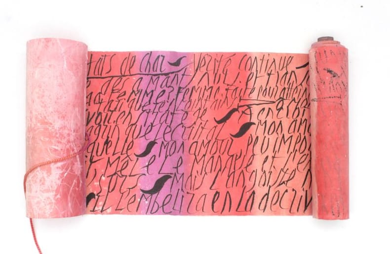 S.l., s.n., 1992. 1 volumen, emboîtage illustré par l'artiste, liens roses (une déchirure au dernier quart du rouleau).