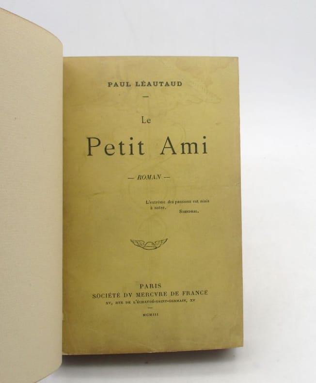 RARE ÉDITION ORIGINALE du premier livre publié par l'auteur. Tirage à 1.089 exemplaires non numérotés du premier livre publié par l'auteur (selon Talvart). Exemplaire imprimé sur papier d'édition, (il n'y a eu que 3 (ou 6 ?) rarissimes grands papiers sur Hollande non mis dans le commerce). Exemplaire bien conforme au premier tirage à l'adresse de la rue de l'Echaudé Saint-Germain à la page de titre et sur la couverture avec l'extrait du catalogue in-fine imprimé sur papier vieux rose. (Talvart et Place 1-A p 8 et d'après Léautaud dans son Journal Littéraire, il y en aurait eu au moins six.). Le Petit ami est le seul roman publié par Léautaud. Il y évoque sur le ton de la confidence autobiographique son adolescence montmartroise ainsi que sa mère trop tôt disparue. Léautaud s'est toujours opposé à la réimpression de cet ouvrage, partagé entre le désir de réécrire le livre et celui de ne pas l'avoir écrit. TRÈS BEL EXEMPLAIRE. Photos sur demande.
