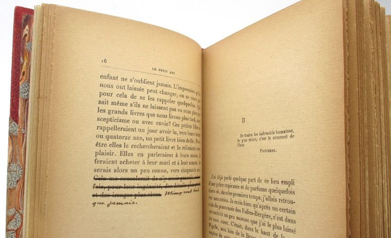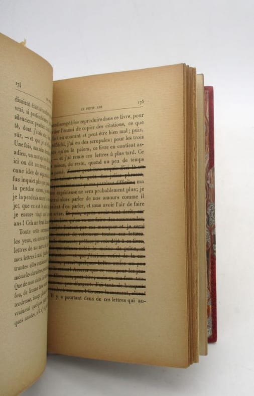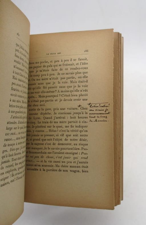 Édition originale de ce roman. Exemplaire du premier tirage avec la cocotte rouge en justification. Celui-ci comporte 28 corrections autographes, parfois de longs passages. Le tirage n'est pas annoncé mais Léautaud le précise dans une lettre adressée à Raoul Simonson le 16 juillet 1931 : "Il a été tiré du Petit Ami uniquement six exemplaires sur Hollande pour l'auteur [...]". Ce premier roman de Léautaud a été pressenti à son époque pour le Goncourt mais il échoue face Force ennemie de John-Antoine Nau. Malgré un certain succès critique et commercial, Léautaud ne se trouve pas pleinement satisfait de son oeuvre et la tentera de la reprendre des années plus tard. Il en réécrivit effectivement deux chapitres mais ne les publia finalement pas. Paul Léautaud : [exposition organisée par la] Bibliothèque nationale, [Paris, Bibliothèque de l'Arsenal, 13 décembre 1972-4 février 1973], pp. 29-30. Rare, bon exemplaire bien établi par Gauché dans une belle reliure de demi-maroquin à coins. * Membre du SLAM et de la LILA / ILAB Member. La librairie est ouverte du lundi au vendredi de 14h à 19h. Merci de nous prévenir avant de passer,certains de nos livres étant entreposés dans une réserve.