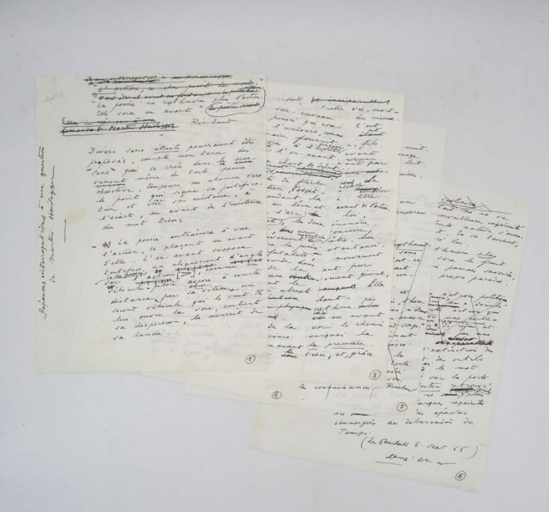 Manuscrit autographe signé en deux parties. Le texte s'ouvre une citation de Rimbaud, partiellement biffée "La Poésie ne rythmera plus l'action. Elle sera en avant." (extraite de la Lettre du voyant) qui est le point de départ de cet essai philosophique sur la nature de la poésie. Il est composé des réponses faites au philosophe allemand et ami de longue date de René Char, Martin Heidegger. Il comporte de nombreuses corrections et ajouts autographes. La seconde partie débute sur une citation de Céline : "Notre vie est un voyage / Dans l'hiver et dans la nuit / Nous cherchons notre passage / Dans le ciel où rien ne luit." (extraite du Voyage au bout de la nuit). Elle est consacrée à Rimbaud et sa vision de la poésie. Les deux textes ont paru dans À la recherche de la base et du sommet en 1955, soit onze ans auparavant le présent manuscrit qui est donc une copie ultérieure. Le texte a été repris pour paraître dans dans la Nouvelle Revue française du 1er décembre 1966 sous le titre En Compagnie. Il comporte de longs passages qui ne furent finalement pas publiés par la revue littéraire. Fortier, Anne-Marie. « Chapitre 5. Lombre sur la rive ». René Char et la métaphore Rimbaud, Presses de lUniversité de Montréal, 1999 [en ligne]. * Membre du SLAM et de la LILA / ILAB Member. La librairie est ouverte du lundi au vendredi de 14h à 19h. Merci de nous prévenir avant de passer,certains de nos livres étant entreposés dans une réserve.